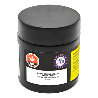 In the heart of Simcoe County, Ontario, you'll find a 3.5-acre property with a state-of-the-art indoor greenhouse facility. That's where Stinky Greens Organic grows their high-quality cannabis. Since 2018, Stinky Greens Organic has been earning trust and admiration among their customers, thanks to their dedication and carefully handled product. All of their cannabis is grown in coco soil to allow sufficient air flow and water circulation. Plus, the facility is a closed loop and CO2 enhanced, ensuring no elements from the outdoors make their way in. Grown using the Sea of Green Method, every Stinky Greens plant is hand-watered then hang dried. They are cold cured for 14 days, then dry-trimmed to start and finished off by being hand-trimmed by the Master Grower. This ensures the trichomes and integrity of the bud remain intact. Stinky Greens Organic Sticky Larry is a cross between Motor Breath and Larry OG, and is an indica-dominant strain with high THC. Sticky Larry's main terpenes are