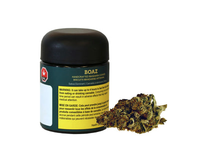 BOAZ Handcrafted Mandarin Cookies features a high-THC potency sativa-dominant hybrid of Forum Cut Cookies and Mandarin Sunset. The flowers have dark green and purple accents scattered throughout sticky trichomes. Mandarin Cookies showcases the sweet aromas of pine (beta-pinene), floral and fruity (nerolidol) with peppery undertones (beta-caryophyllene). Our product was grown as a small batch in a high-tech indoor facility in central Alberta. Every bud is carefully hung dried, hand trimmed and cold cured to our exact standards.