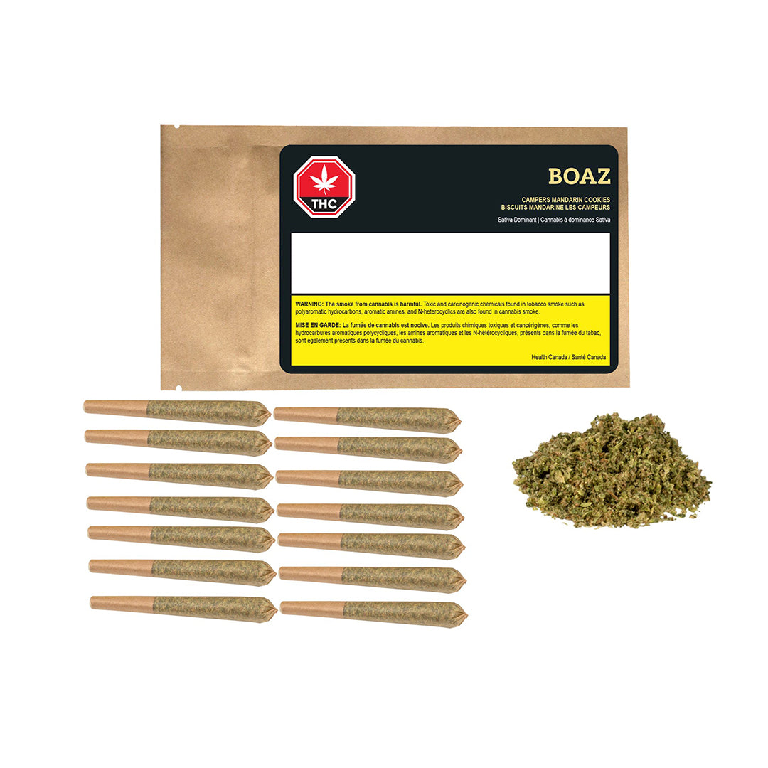 Campers Pack Mandarin Cookies Pre-rolls are a rare sativa-dominant hybrid strain. If you're looking for a super bright flavour, you've found it! Mandarin Cookies packs a sharp tangy citrus flavour with hints of rich nutty herbs upon exhale, almost like an almond cookie! The aroma is very earthy and kushy with a sour tangerine overtone that turns slightly pungent as the buds are burned. BOAZ Craft Cannabis premium flower pre-rolls are always made with full buds. Each pre-roll is crafted by hand from being filled, rolled and packaged.