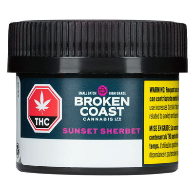Sunset Sherbet is one of the more coveted cultivars ever grown by Broken Coast. Exhibiting dense indica flowers with deep purple and silver colouration, the large swollen calyxes are covered so thickly in glandular trichomes they're almost white. With the most abundant terpenes being caryophyllene, myrcene and limonene, Sunset Sherbet may be our most fruit-forward strain yet, evoking the truly unique smell and taste of a basket of strawberries and guava. But don't let those rich aromas fool you, there's prominent dank and pungent undertones that any great cannabis cultivar should have. Always grown indoors in small-batch, strain-specific rooms, then slowly hang cured and hand trimmed. At Broken Coast, we grow woah.