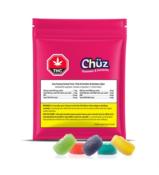 Chuz Variety Packs deliver five unique flavours of sour fruit explosion in every pouch. Each pouch includes five 4.5g soft chews with 2mg of THC per chew, and flavours include Sour Strawberry, Sour Wildberry, Sour Grape, Sour Lime and Sour Pineapple. These delicious and colourful treats are handcrafted by our dessert and confectionary chef in the Canadian Rockies. Chuz uses MCT oil in the creation of all our edibles.