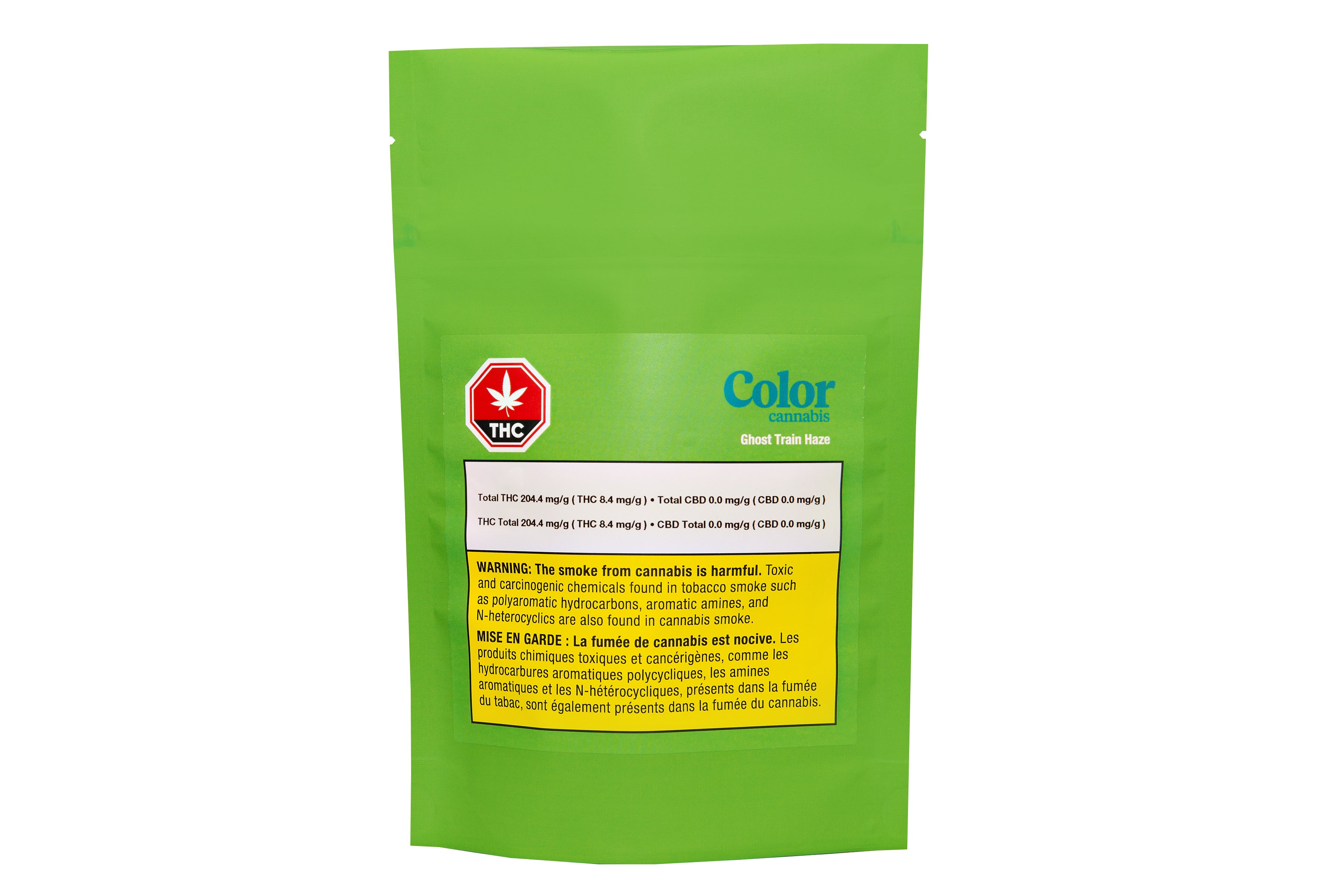 Not your typical sativa, Color's Ghost Train Haze has thick, dense buds blanketed in crystal-capped trichomes. This cultivar gives off an earthy aroma with floral and citrus undertones. Known to be a strain with a rich terpene profile and very strong THC potency potential, Ghost Train Haze is a genetic blend of Neville's Wreck and Ghost OG. Color Cannabis products are grown in southern Ontario, using state-of-the-art greenhouses with strain-specific nutrient and water regimes to ensure the purity of each plant. Cannabis flower is harvested with care and dried naturally, for optimal flavour and freshness. Our new nitrogen infused pouches lock-in freshness and are 80 per cent less waste than conventional packaging!