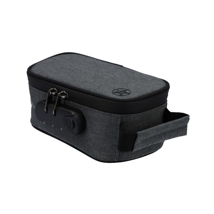 Store your stash in style. This new smell proof bag from Famous Design lets you keep your stash and smoking accessories all in one place. Durable and padded, this bag is 80mm x 180mm x 80mm. Toss it in your bag if you’re on the go, or leave it at home without any smells leaking out. Lock it up when you need to with a personalized code knowing everything inside is safe. This rectangular bag is adorned with the classic, black Famous Brandz star on the front to match the handle, lock and zipper and looks great against the dark, grey fabric bag.