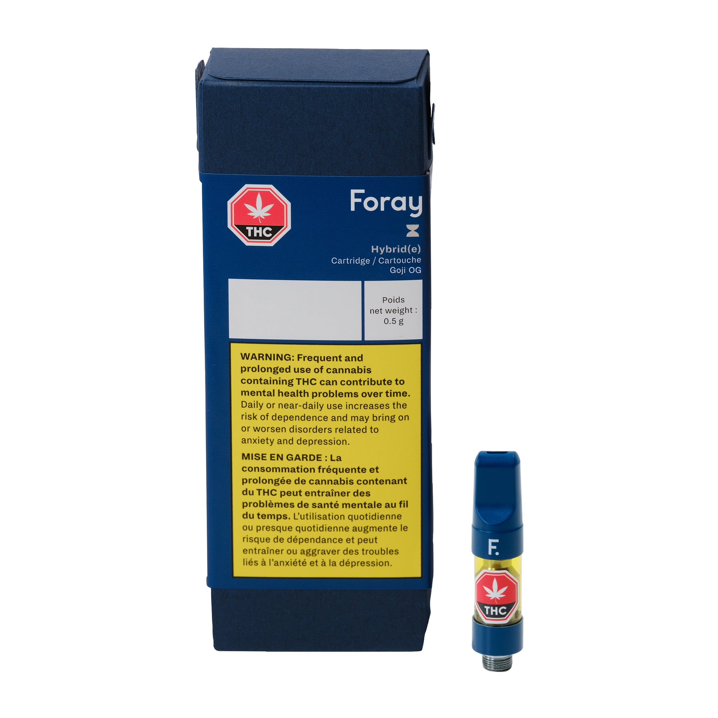 Foray Gogi OG 0.5 g vape cartridges is sativa blend which has Limonene as the dominant terpene providing hints of lemon, lime and juniper flavours. None of our vapes contain vitamin E acetate. This high-quality distillate is in a no-leak cartridge system and is calibrated to work best with Foray's 510 thread rechargeable battery, resulting in a consistent and enjoyable experience. Battery and charger not included.