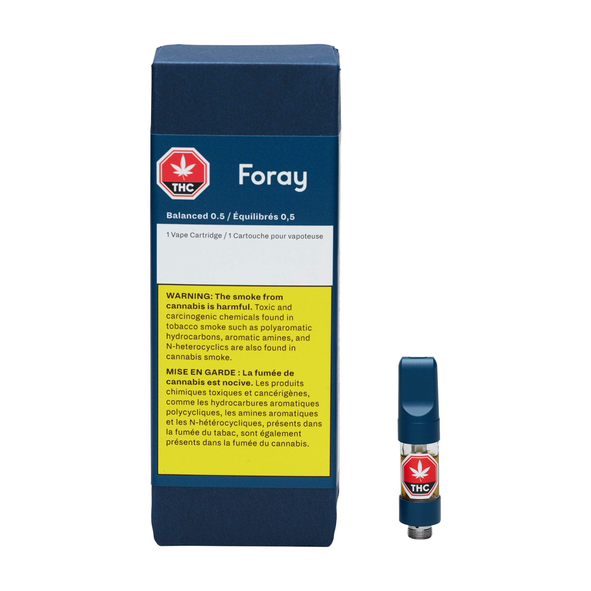 Foray vape cartridges are designed to be used with Foray batteries, which are available in our Foray Vape Cartridge Starter Packs and are also sold separately. Foray vapes offer a discreet method to cannabis consumption. Our vape formulations are made with only high-quality cannabis distillate and botanical terpenes. The terpenes in our balanced blend provide an initial zesty, citrus flavour with juicy orange notes and finish with woody, dry and warm notes. None of our vapes contain vitamin E acetate. Foray vapes are tested rigorously and use a proprietary battery and hardware system that is calibrated specifically to our vape cartridges, providing a smooth and enjoyable experience with every use. Each vape pen uses leak-resistant technology. Compatible with 510 thread devices only. Device not included.
