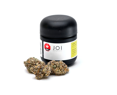 Cake Crasher #1 is a hybrid strain bred from Wedding Cake and Wedding Crasher. It boasts a strong berry and licorice aroma with slight earthy undertones. CC1 has varying terpene levels of limonene, nerolidol, myrcene, caryophyllene and pinene. This colourful flower is dense and very frosty. At Joi we hang dry hand trim and cure in stainless steel containers for at least 14 days to ensure a quality finish. Glass jars are filled by hand and include humidity packs inside to maintain optimal freshness. Enjoi.