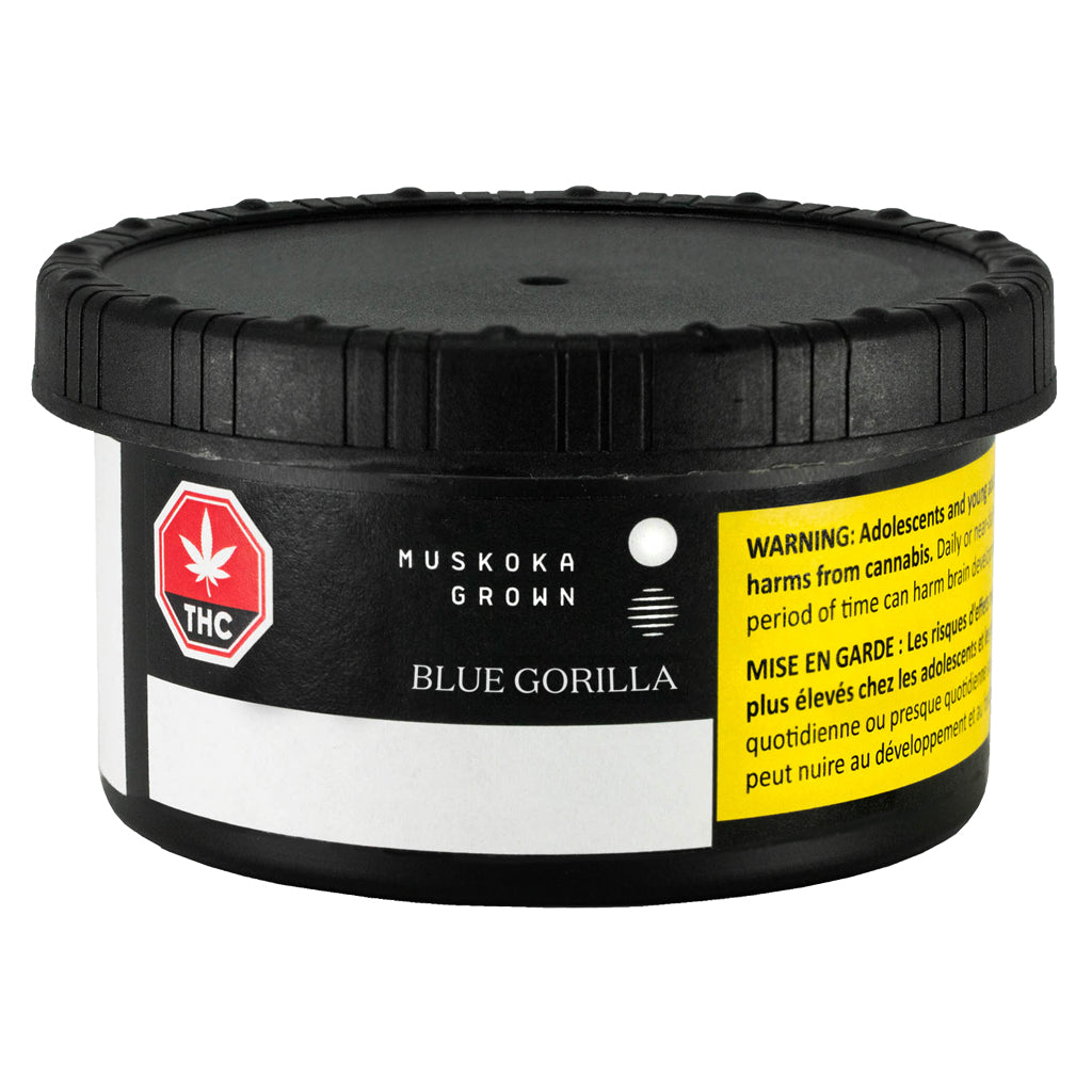 Blue Gorilla derives its name from its strong genetics and sweet terpene profile. A vibrant cross between OG Kush, Gorilla Glue and Blueberry, this smooth, moderate-THC hybrid is densely stacked with frosted lime-green buds. It displays sweet scents of pine and fruit reminiscent of our natural, beautiful Muskoka home. Focused on delivering fresh product, Muskoka Grown packages its 3.5g using nitrogen injection to protect terpenes and cannabinoids.