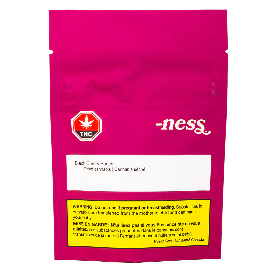 Black Cherry Punch from -ness is a high-THC, indica-dominant hybrid with a juicy, earthy flavour and aroma. Its sweet and citrusy notes come from a delightful swirl of terpenes, including linalool, limonene and fenchol. Featuring dark green buds, fiery orange pistils and sugary trichomes, this flower is sure to leave a lasting impression in the punch bowl of your soul. Best of all, it's grown indoors right here in beautiful Alberta! Explore your -ness.