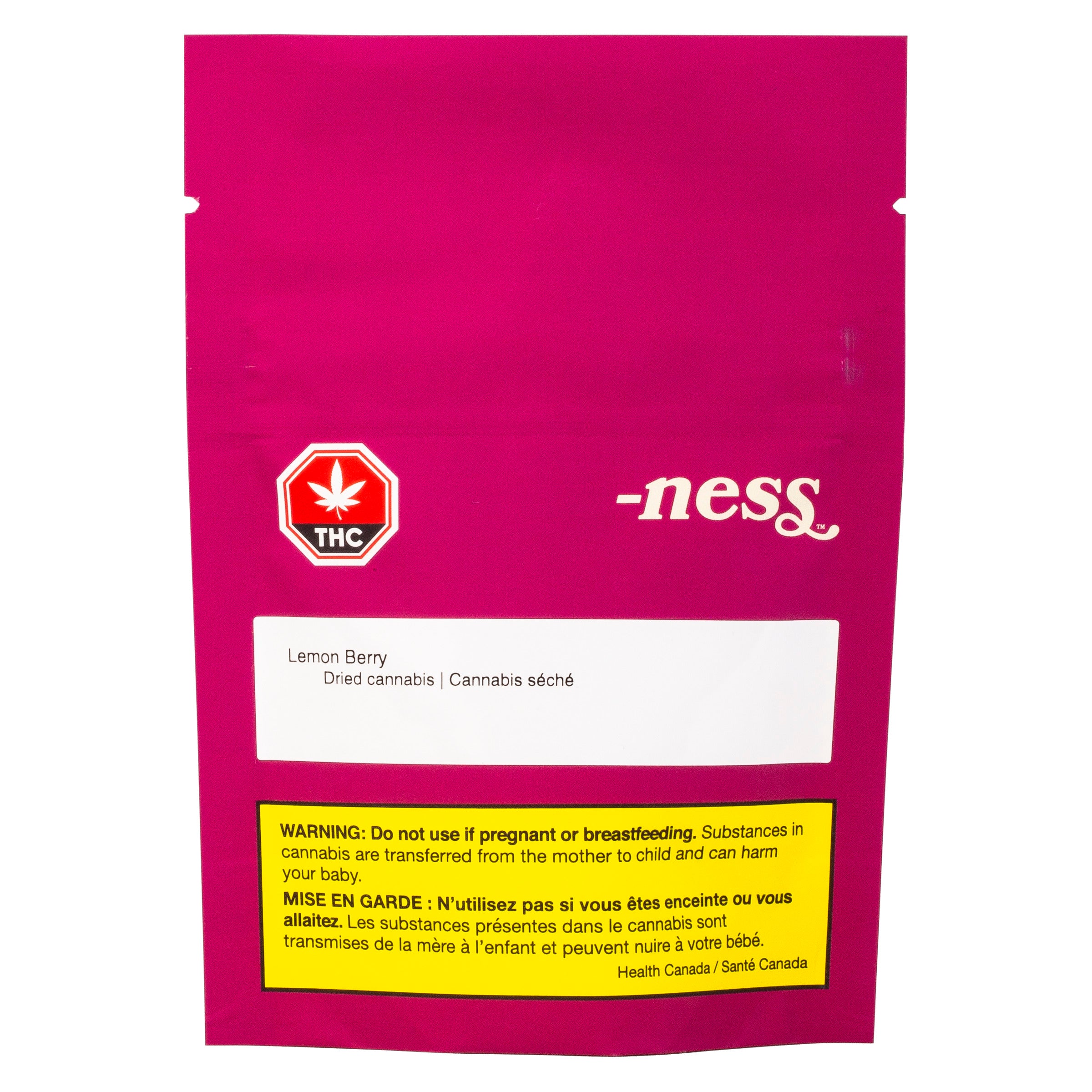 Lemon Berry from -ness might sound like your favourite '90s lip gloss but it's actually a well-balanced, fruity hybrid with high THC. Its terpene profile imparts a bright and citrusy flavour dotted with vanilla bean and wild blueberries, rounding off with a creamy finish. A descendant of Lemon Thai and Dabney Blue, this indoor-grown strain boasts oversized dark green buds flecked with striking orange pistils. Just gorgeous. Explore your -ness.
