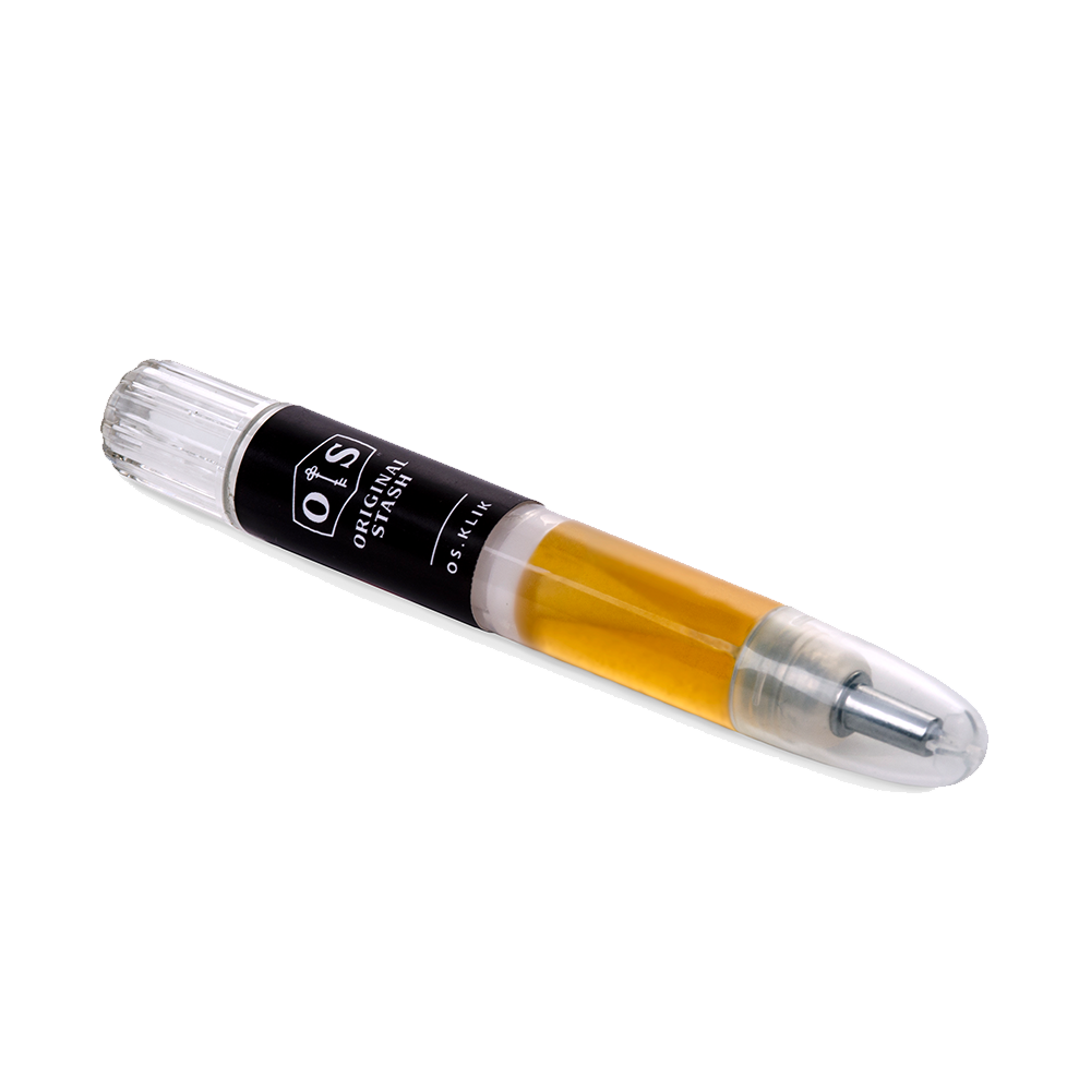 Exclusive to Canada, OS.KLIK is an easy-to-use distillate dosing pen for dabbing and other concentrate uses. The OS.KLIK applicator provides consumers with precision dose control and a mess-free, portable and discreet concentrate experience. Each audible 'click' from the applicator dispenses 25mg of the OS.KLIK Durban, a sativa cannabis distillate featuring terpenes including caryophyllene, humulene and limonene. The distillate can be inhaled or ingested and does not contain any additives, diluents, pesticides or heavy metals -- just distillate and terpenes. Each OS.KLIK applicator will dispense approximately 40 KLIKs.