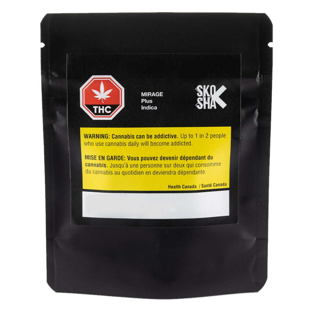 Mirage Plus by SKOSHA is indica-dominant with high, potent THC. These buds are lightly trimmed and handled carefully throughout the harvest process to protect trichomes and terpenes. Expect a strong earthy aroma with hints of spice and citrus within the large dense flower. It is available in various dried flower sizes and pre-rolls. This flower, produced by SKOSHA, is packaged in a moisture-locking bag and is non-irradiated.