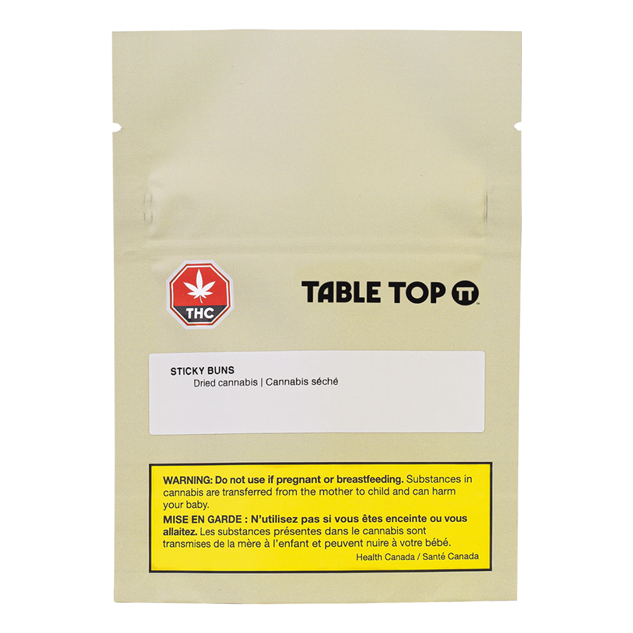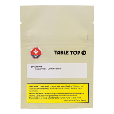 Sticky Buns from Table Top is a flavourful indica-dominant hybrid with very strong THC potency potential and a charming, sweet smell that's almost a funny joke because by the time the robust flavour hits your tongue you'll be like, damn, they're more like OG buns of steel. A combination of Kush Mints and Gellati, this BC-grown hybrid brings distinct vanilla and cookie flavour from a terpene blend of caryophyllene, myrcene and linalool. The sticky in the name comes from the big, sticky trichomes that cover the dense, deep green buds. We'll leave the buns up to your imagination, but you can rest assured it's got legs.