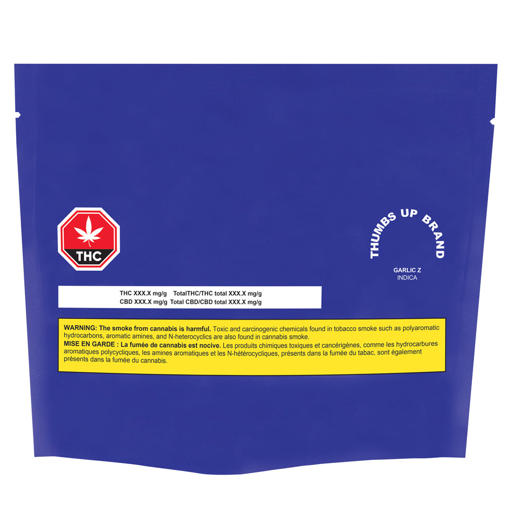Not just for garlic lovers. Thumbs Up Brand Garlic Z is a high-THC, classic indica-dominant flower. Bred from Afghani genetics, the strain is a cross of Garlic Cookies and OZ Kush. Brace yourself as a pungent garlic, spice and diesel flavour washes over you. The strain is hang dried and hand manicured with a high total terpene content. Dominant terpenes include caryophyllene, myrcene, and limonene. Thumbs Up Brand Garlic Z is available in a. 3.5g dried flower. Ten per cent of all profits from the sale of Thumbs Up Brand products are donated back to the community.