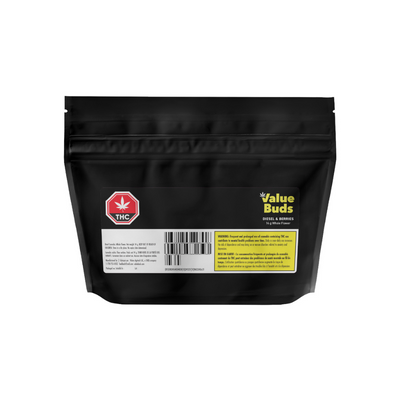 "Value Buds Diesel & Berries Big Bags are a carefully chosen blend of whole flower with fruity and gas flavours. Expect a mix of our favourite jammy, earthy and diesel buds delivering a flavourful and smooth smoke. We created Value Buds Big Bags with quality and value in mind, so you can always expect a minimum of 20%+ THC.
