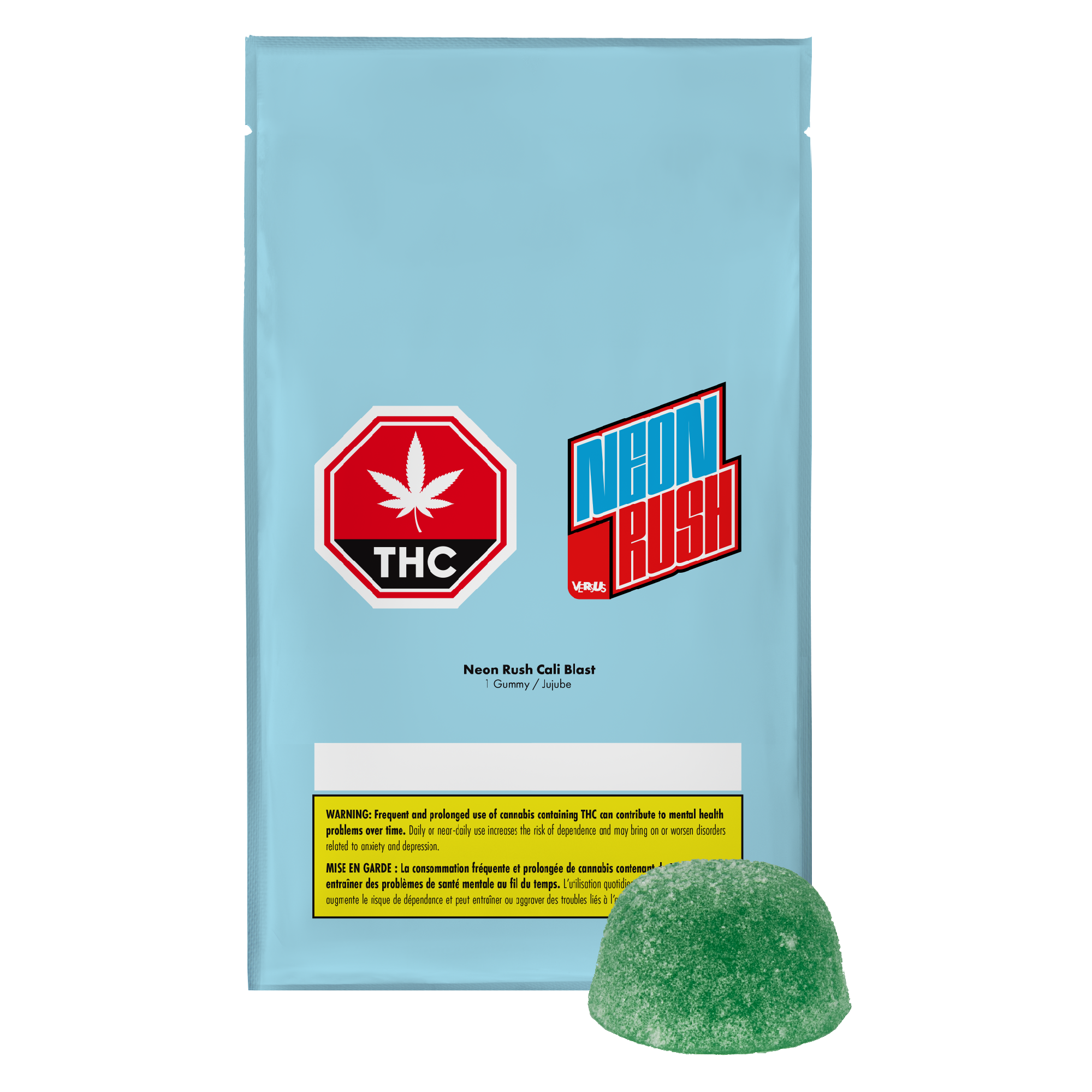 Get ready for a surfside splash of tropical-lime flavour alongside max THC! Versus Neon Rush Cali Blast Gummy packs a punch with 10 mg THC and 10 mg of naturally occurring caffeine. This single pectin-based gummy delivers a refreshing surge of sweet, fizzy flavour.