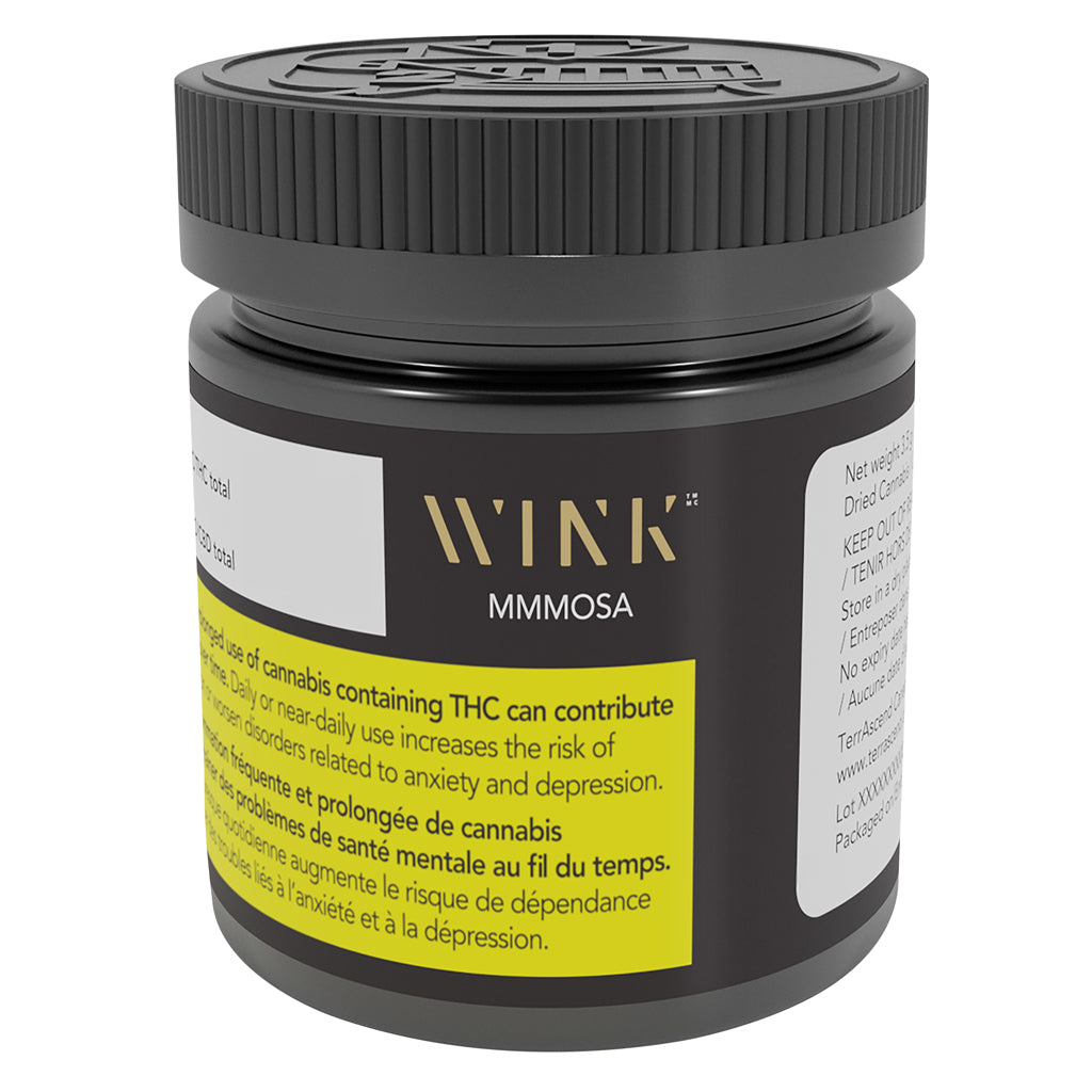 WINK MMMOSA is an award winning high THC, sativa dominant hybrid. A cross between Clementine and Purple Punch, this proprietary pheno of Mimosa was coined Tutti Frutti by the craft growers at Freedom Cannabis for its rich terpene profile. The strain carries a deliciously sweet citrus flavour, with creamy, earthy undertones from its pinene, myrcene, and caryophyllene terpenes. WINK MMMOSA is indoor grown, gently machine trimmed and hand manicured by the team at Freedom Cannabis. This popular strain was awarded second place in the sativa category at the 2018 High Times Cannabis Cup. WINK MMMOSA is available in a 3.5g dried flower. Each pack contains a boveda for maximum freshness. 10% of the profits from all WINK products are donated back to the community.