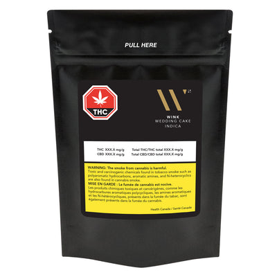 Not just for special occasions. WINK WEDDING CAKE is a high-THC, indica-dominant flower. A cross between the popular Girl Scout Cookies strain and Cherry Pie, you'll be hit with a sour tangy and earthy taste with a mouthful of cake-like creaminess. WEDDING CAKE is indoor grown, hang dried, and hand manicured to perfection. Dominant terpenes include caryophyllene, nerolidol, and pinene. WINK WEDDING CAKE is available in 3.5g dried flower. Ten per cent of all profits from the sale of WINK products are donated back to the community.